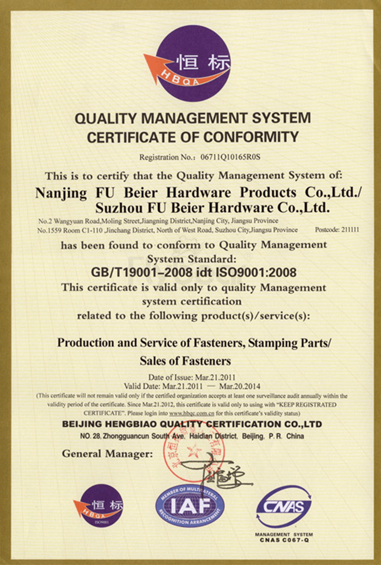 福贝尔质量管理体系认证书 (中文)